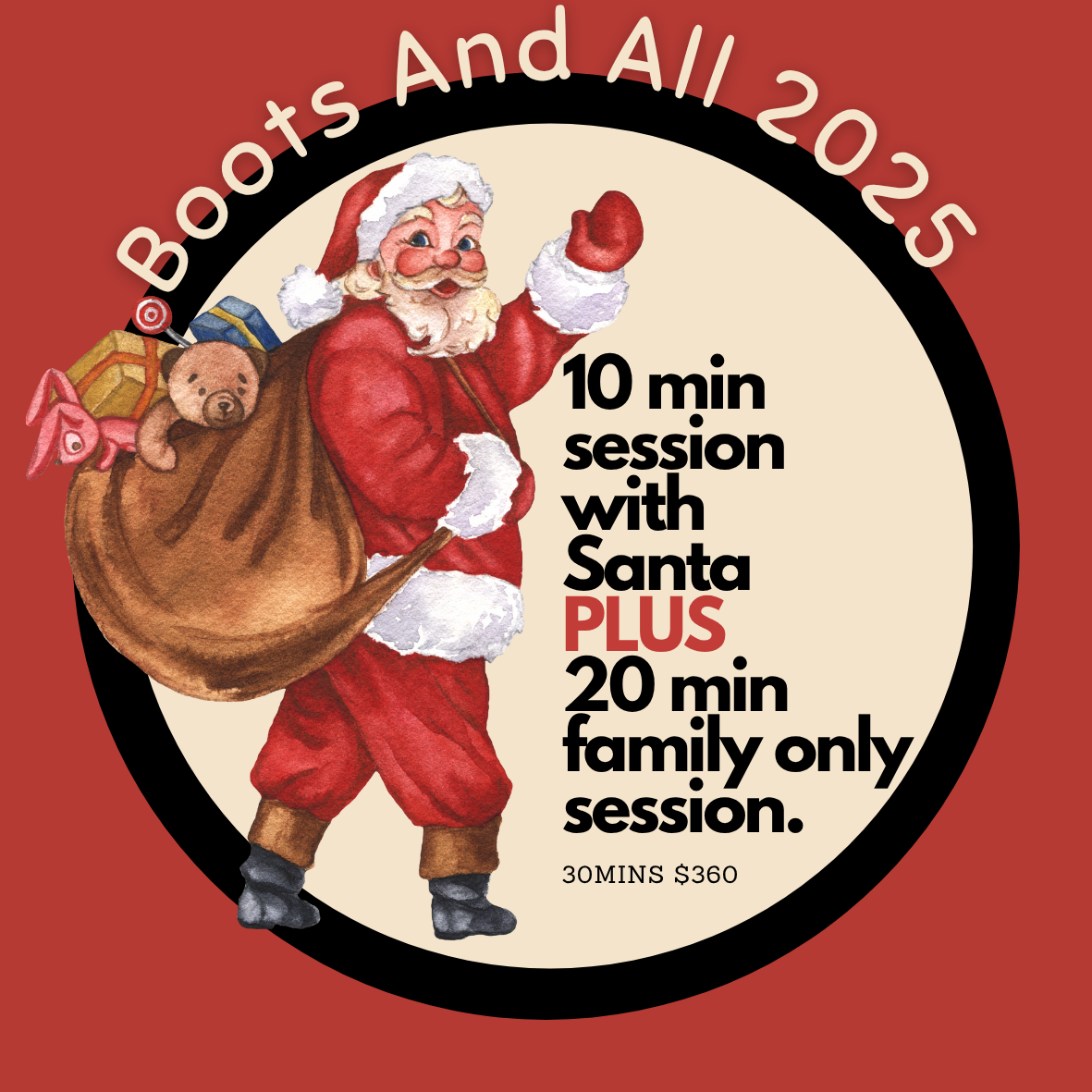 We have a mixture of 10min (Santa Only Sessions) and 30min (Boots and All) sessions Please check carefully before booking your session.
